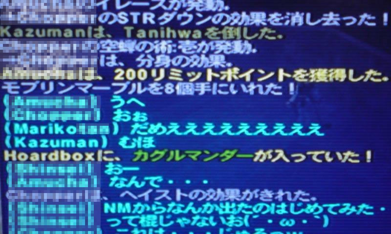 ゾンニュアさんに出会えなかったのは残念ですが、こちらのカグルマンダーさんもなかなかイイ性能だそうで、青魔出勤が多いちょ様とおはぎ君でロット勝負をしてもらい、ちょ様の手元へ渡りました。「ネコさんつかわないの?」って聞かれたけど、ネコが持ってても普段から片手剣を使うようなショブで行動してないし、愛用してくれる人の手元に行ったほうがカグルマンダーさんも幸せですしね。
